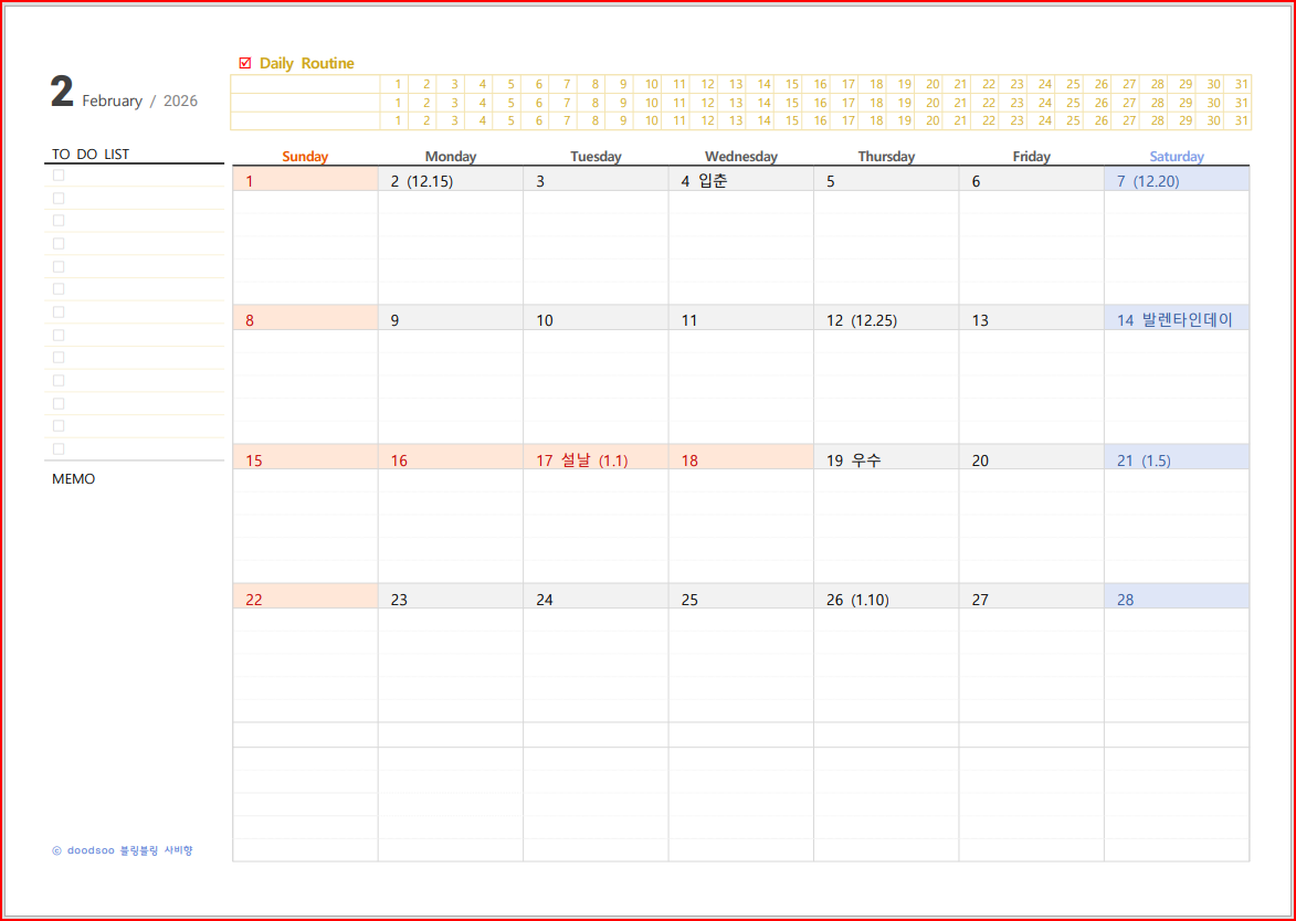 이번에 제작한 파일은 일반적인 달력과는 조금 다릅니다. '쓰기 편한 달력'을 목표로 다음과 같은 디테일을 담았습니다.